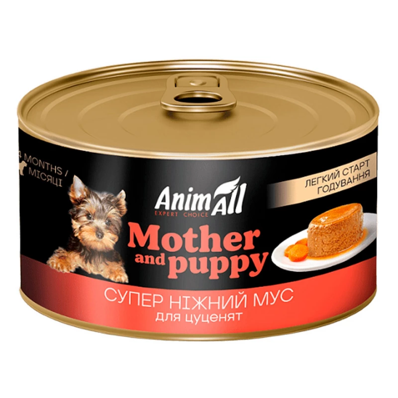 AnimAll Mother and Puppy – вологий корм для собак та цуценят легкий старт годування.  Цей ніжний мус створений для цуценят віком 1-4 місяці, а також для вагітних і лактуючих собак, забезпечуючи їхній організм усіма необхідними поживними речовинами. Завдяки високому вмісту курячого м’яса (32%), яловичої печінки (20%), кролячої печінки (10%) та сухого козячого молока (1%), корм легко засвоюється та підтримує здоровий ріст і розвиток.