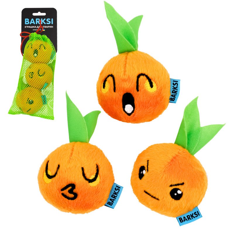 Набір іграшок Barksi! До комплекту входять три мандаринки у формі м’ячиків, виготовлені з м’якого плюшу. Кожна мандаринка прикрашена милою вишивкою у вигляді обличчя. Всередині кожної мандаринки пищалка, яка під час гри неодмінно викличе цікавість вашого собаки та забезпечить йому активне дозвілля. Усі мандаринки акуратно упаковані в мішечок-сітку, зручний для зберігання.