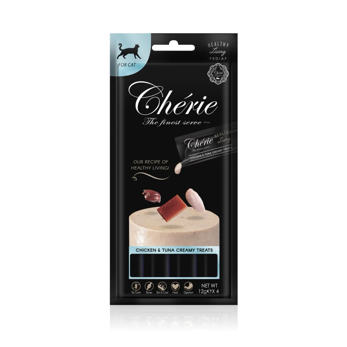 Cherie Healthy Living Creamy Treat Cat Chicken & Tuna Puree – кремові ласощі з тунцем, куркою та курячою печінкою для дорослих котів, у стіках 4х12г