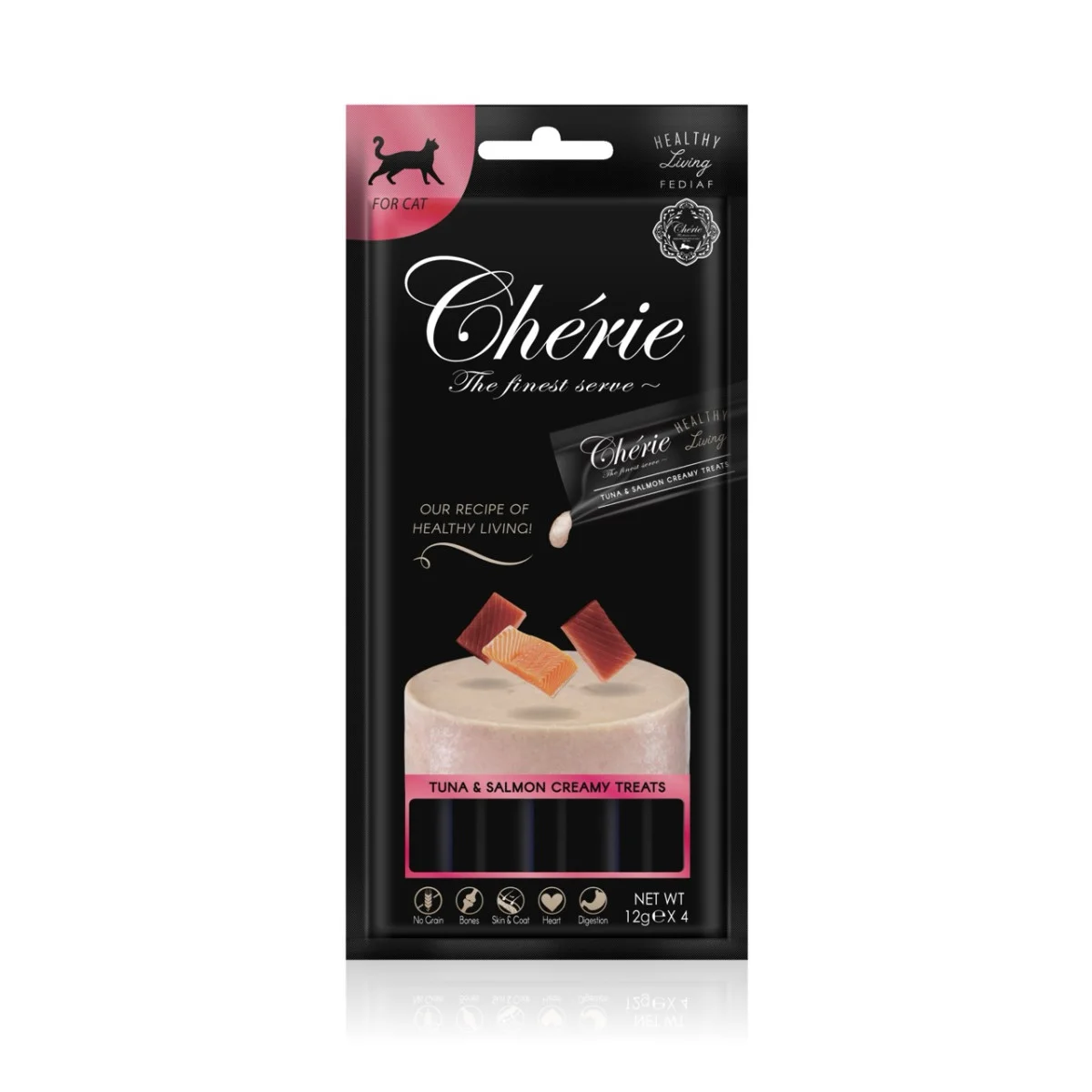 Cherie Healthy Living Creamy Treat Cat Tuna & Salmon Puree – кремові ласощі з тунцем та лососем для дорослих котів, у стіках 4х12г