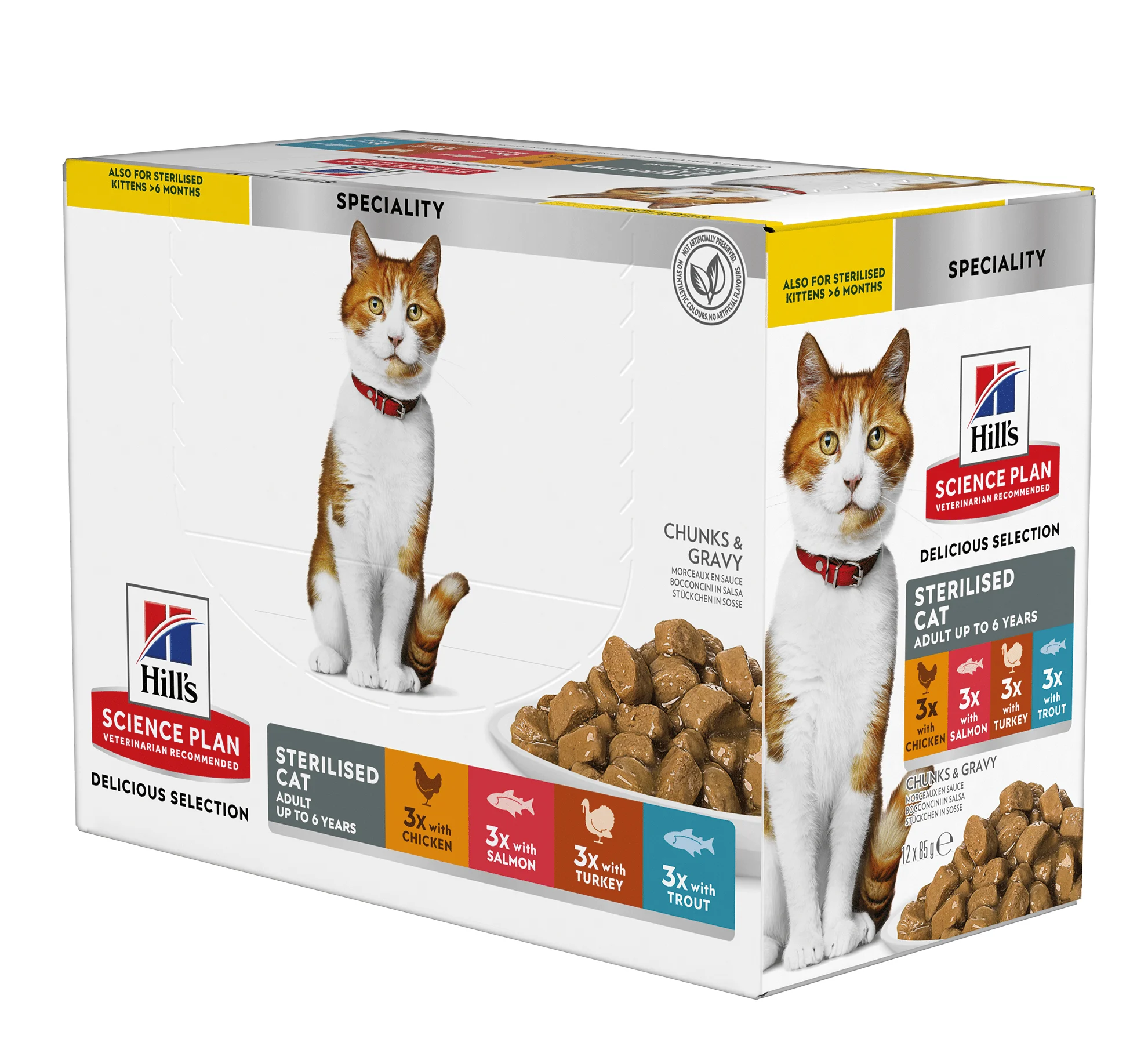Набір повнораціоного вологого корму Хіллс для дорослих стерилізованих котів віком 1-6 років – 4 смаки (курка, лосось, індичка, форель)