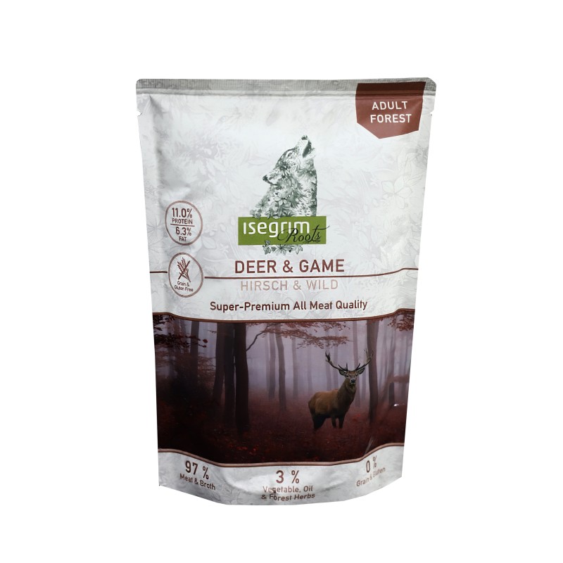 Паучі Ізегрім Isegrim Pouch Roots Adult Forest Deer & Game – повнораціонний беззерновий вологий корм з олениноюі м’ясом дичини з коренем петрушки, соєвою олією і лісовими травами для дорослих собак усіх порід. Цей збалансований раціон дуже схожий з харчуванням собаки в природному середовищі існування та містить необхідну кількість поживних речовин для підтримання загального здоров’я, високого рівня імунітету та гарного зовнішнього вигляду.