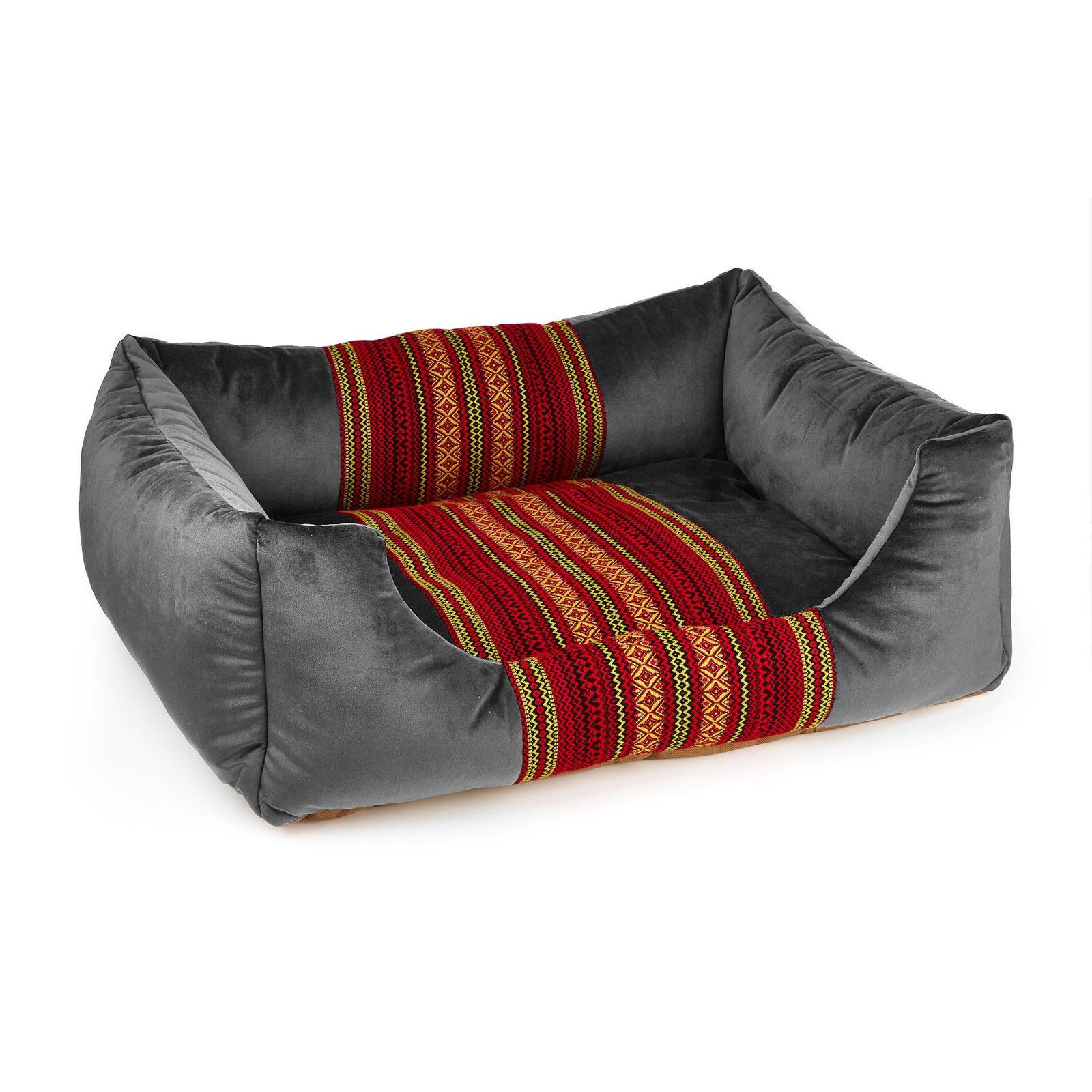 Ця зручна лежанка виготовлена з м’якої та приємної на дотик велюрової тканини, стійкої до зношування та акцентом на український етнічний візерунок тканини, яка використовується при виробництві елементів одягу національного українського костюма.