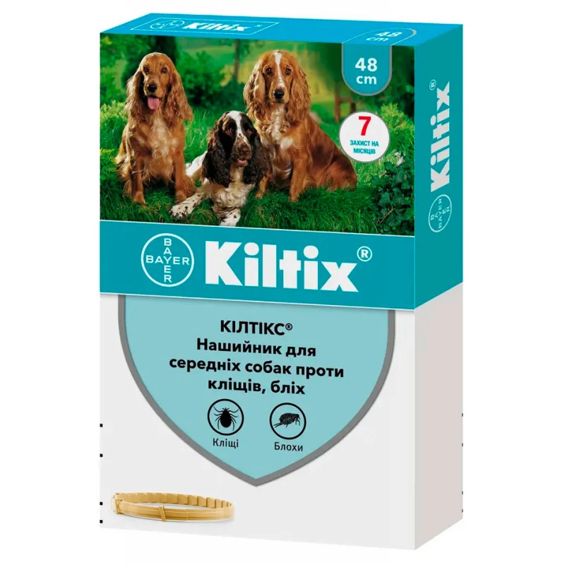 Kiltix ( Кілтікс ) Нашийник для собак – інсекто-акарицидний нашийник для собак, що захищає від бліх та кліщів протягом 7-ми місяців. Довжина нашийника підбирається відповідно до розміру собаки.