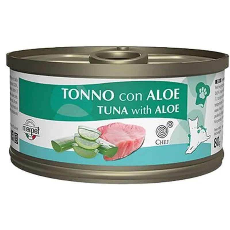 ( Марпет ) Marpet Chef для котів тунець з алое – консерва для котів, приготовлена з оброблених вручну найвищої якості натуральних інгридієнтів. Ніжні штаточки м’яса тунця з додаванням натурального алое у власному соку.