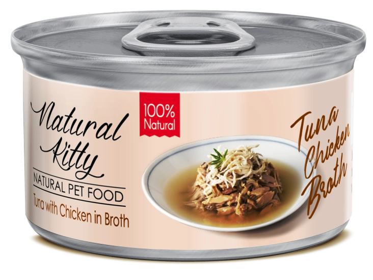 Консерва Natural Kitty Tuna with Chicken in Broth Натурал Кітті – натуральний беззерновий, додатковий вологий корм для котів у вигляді бульйону з ніжними шматочками тунця та соковитої курки.
