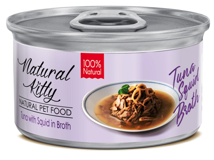 Консерва Natural Kitty Tuna with Squid in Broth Натурал Кітті – натуральний беззерновий, додатковий вологий корм для котів у вигляді бульйону з тунця та кальмара.