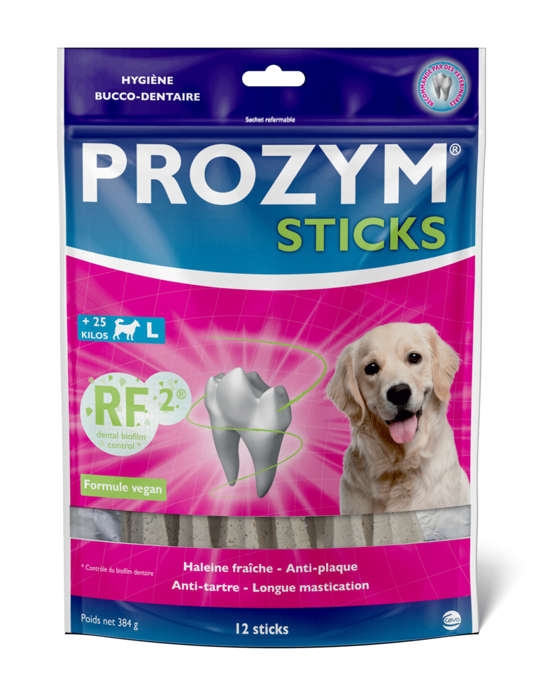 Жувальні стіки PROZYM RF2 містять унікальний запатентований компонент RF2®, який допомагає видалити біоплівку (перший етап утворення зубного нальоту), створену бактеріями в ротовій порожнині у собак, а також відновити здорову мікрофлору у ротовій порожнині собак. Унікальна текстура та ергономічна форма PROZYM RF2 забезпечують довший час жування, що допомагає у боротьбі з нальотом та зубним каменем за допомогою абразивної механічної дії.