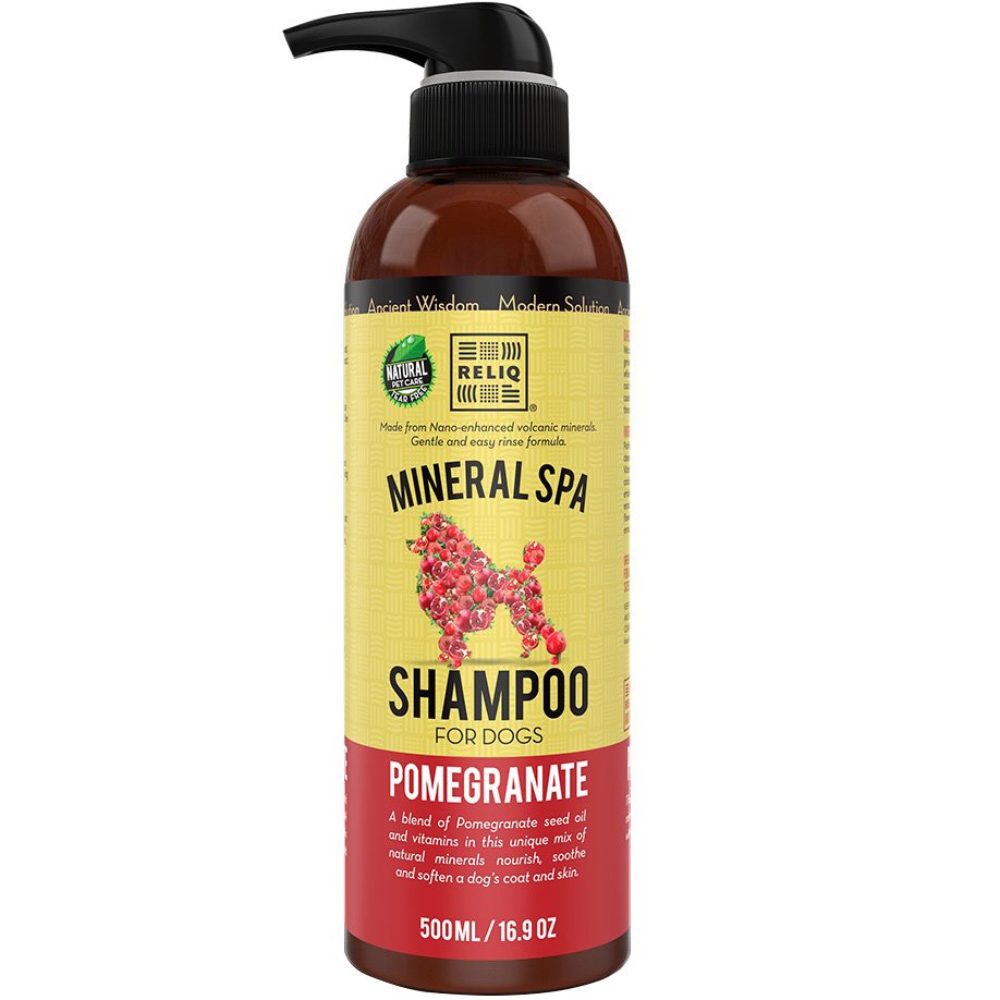 RELIQ (Реліг) Mineral Spa Pomegranate Shampoo – натуральний шампунь з екстрактом граната та вулканічними мінералами для собак і котів. Нові технології виробництва та унікальні компоненти дали змогу створити високоефективний косметичний засіб для очищення та дбайливого догляду за шерстю та шкірою Вашого улюбленця. Безпечно для котів.