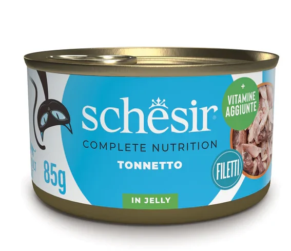 Schesir Tuna in jelly can – це повнораціонний вологий корм, у консервній банці, для котів з ніжним філе тунця та рисом в апетитному желе